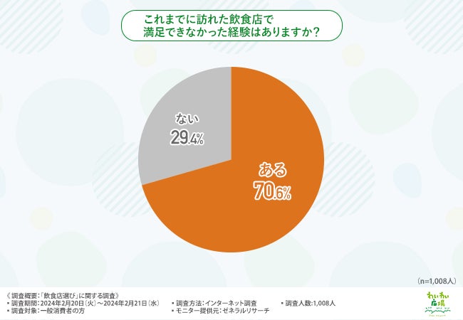 次に「これまでに訪れた飲食店で満足できなかった経験はありますか?」と質問したところ、約7割の方が『ある(70.6%)』と回答しました。