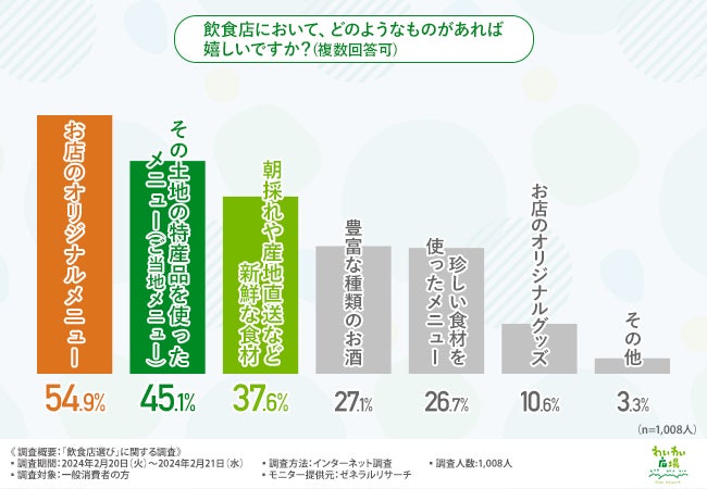 「飲食店において、どのようなものがあれば嬉しいですか?(複数回答可)」と質問したところ、『お店のオリジナルメニュー(54.9%)』と回答した方が最も多く、次いで『その土地の特産品を使ったメニュー(ご当地メニュー)(45.1%)』『朝採れや産地直送など新鮮な食材(37.6%)』と続きました。