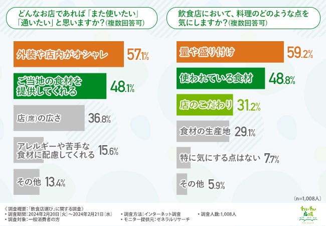 今回の調査で、飲食店を選ぶときにはお店の外観や料理の量・盛り付けなどを気にする方は多いことが明らかになりました。雰囲気や見た目も大切だと考えている方は多いことがうかがえます。