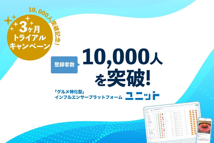 ”グルメ案件”に特化したインフルエンサープラットフォーム『ユニット』がインフルエンサー登録者数1万人を突破。これを記念し、トライアルキャンペーンを開催。