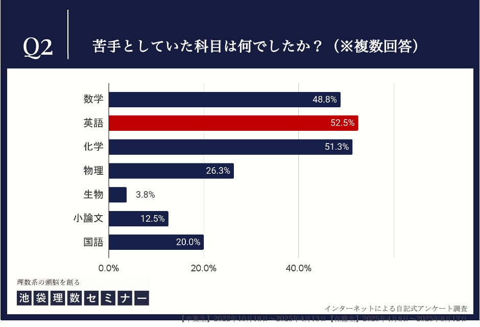 苦手としていた科目を尋ねたところ、理系受験の根幹である「数学」(48.8%)や「化学」(51.3%)を抑え、「英語」(52.5%)が最多となりました。