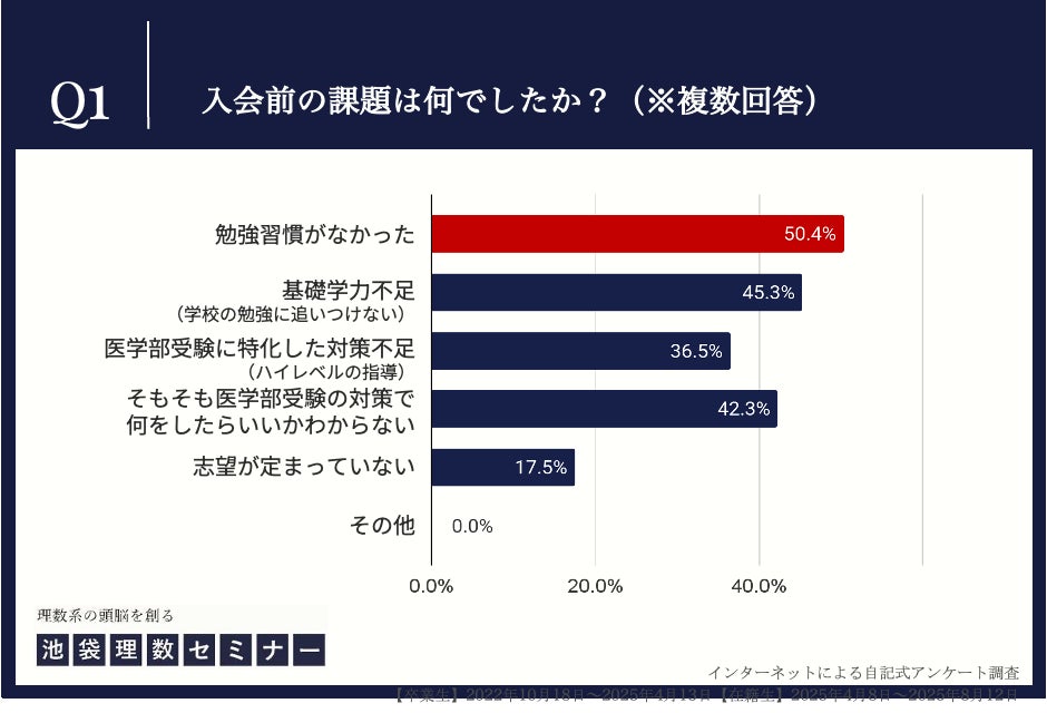 調査概要:医学部専門塾池袋理数セミナー入会前の生徒が抱えていた課題と苦手科目に関する調査
