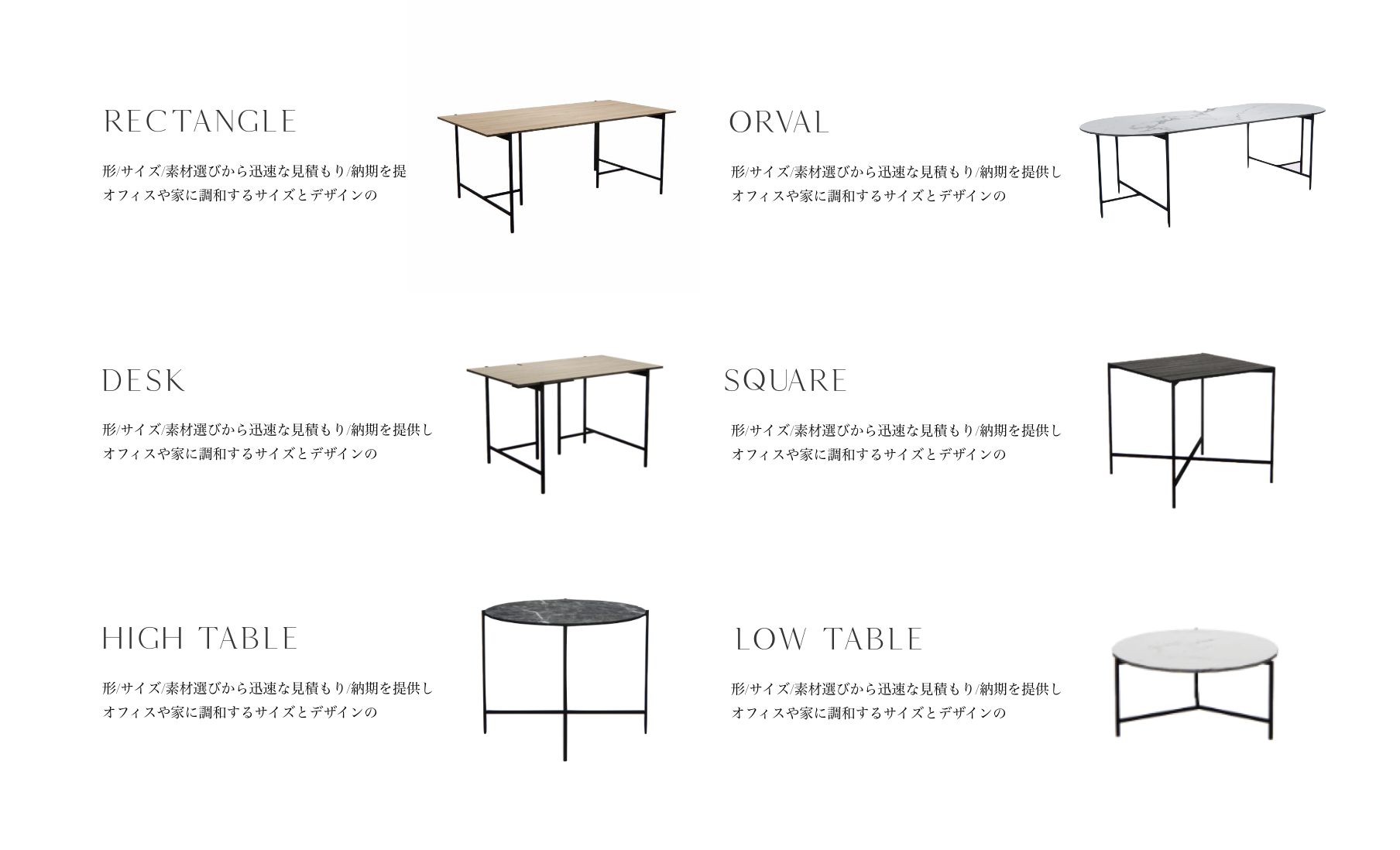 多様な天板の種類を用意し、幅広いサイズの選択肢から理想のお部屋に合うテーブルをWEBにて簡単にオーダーし短納期にてお届けいたします。
