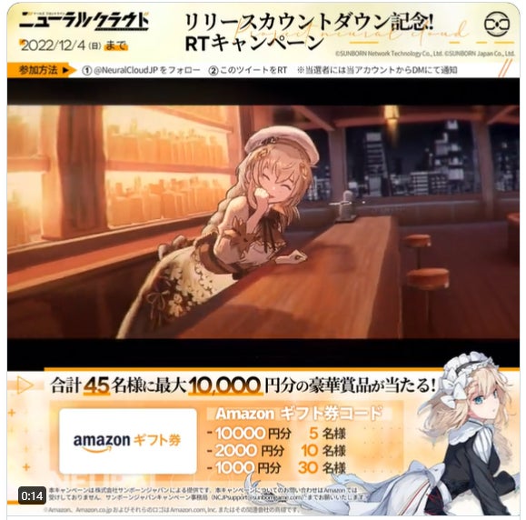 公式Twitterをフォローした上で対象の人形探しのTweetをRTすると、抽選で5名様に1万円分、20名様に2000円分、30名様に1000円分のアマゾンギフト券をプレゼント。さらにニューラルクラウドの屋外広告を撮影して「#ニューラルクラウド #人形探し」のハッシュタグを付けてTweetすると、抽選で5名様に1万円分のアマゾンギフト券をプレゼントいたします。キャンペーンの詳細については公式Twitter(@NeuralCloudJP)をご覧ください。