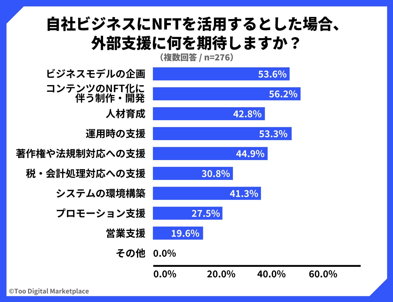 - 外部支援への期待TOP3は「コンテンツのNFT化に伴う制作・開発」(56.2%)、「ビジネスモデルの企画」(53.6%)「運用時の支援」(53.3%)