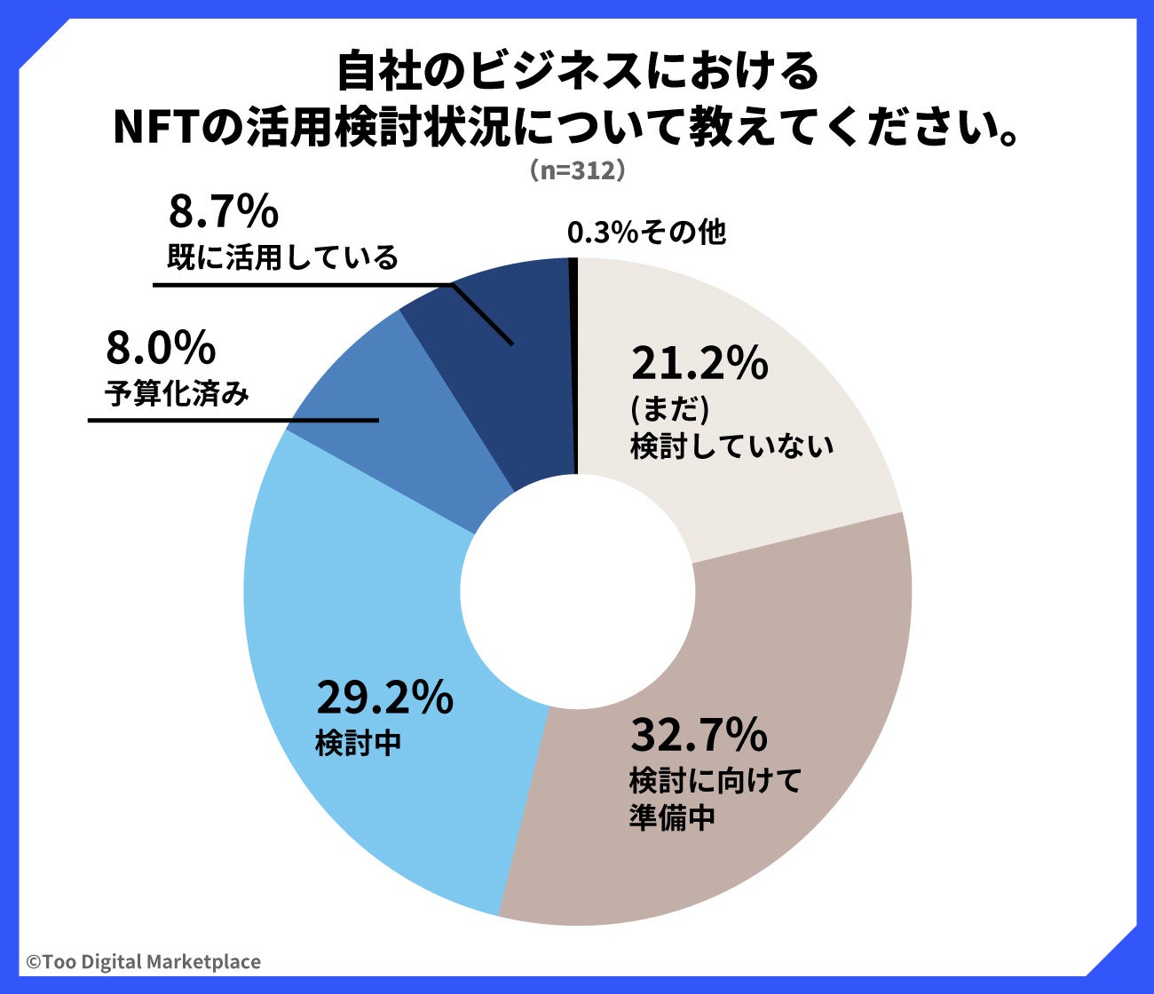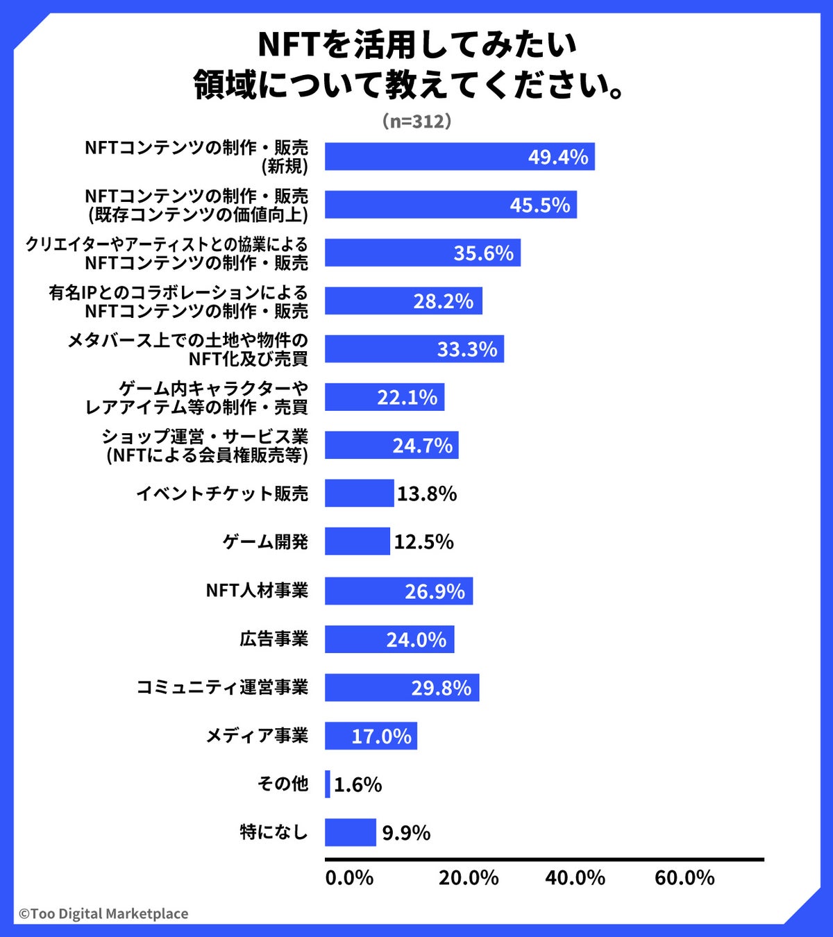 NFTコンサルティング事業を展開する株式会社Too Digital Marketplace(本社:東京都港区、代表取締役社長:手塚康夫、以下「Too DMP」)は、独自にNFT活用に関するアンケート調査を実施し、自社ビジネスでのNFT活用に興味がある、50名規模以上の企業経営層(代表取締役・役員)312名より回答が得られました。