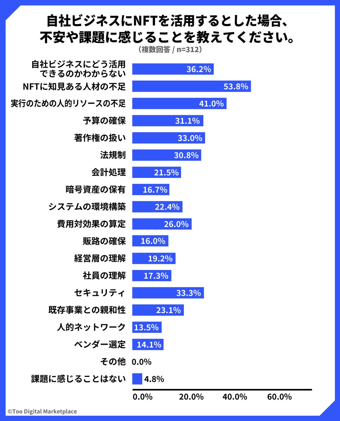 53.8%が「NFTに知見ある人材の不足」、「実行のための人的リソースの不足」も41.0%と人材に関する不安・課題が目立った。また、「セキュリティ」(33.3%)、「著作権の扱い」(33.0%)などシステム、リーガル面でも課題が散見される。