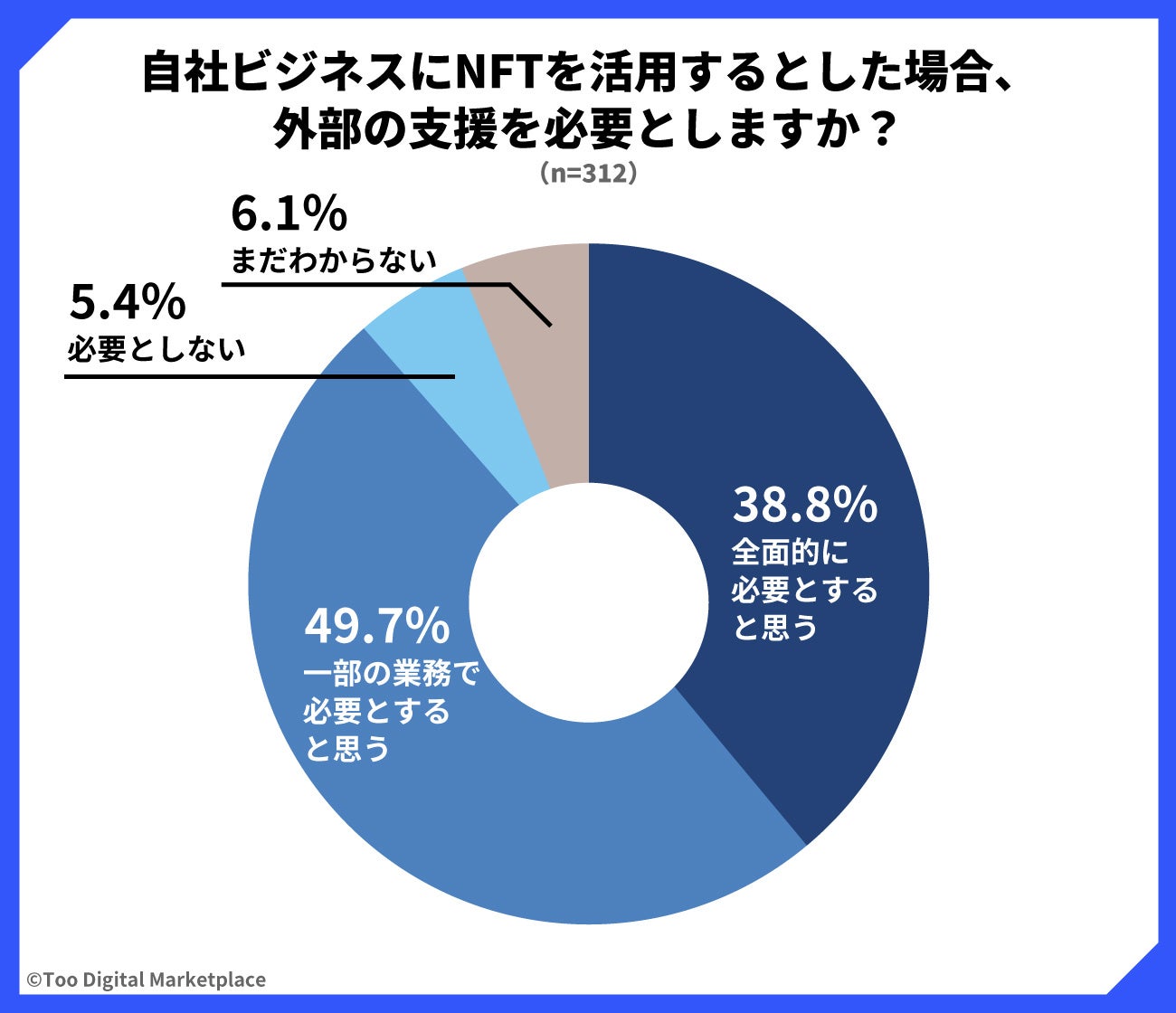 88.5%が外部支援ニーズあり、「全面的に必要とすると思う」も38.8%とNFT活用における外部支援の必要性が明らかに。