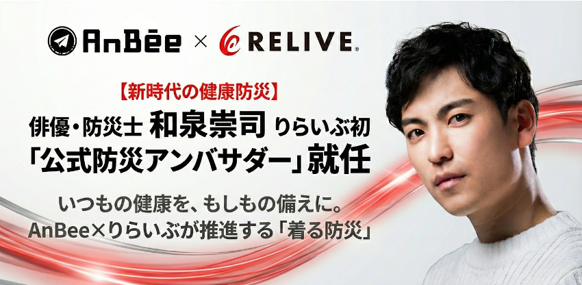 AnBee株式会社(本社:東京都渋谷区、支社:広島県廿日市市、代表取締役:和泉崇司)は、株式会社りらいぶ(本社:宮城県仙台市、代表取締役:佐々木貴史)と防災に関する連携協定を締結し、当社代表の和泉崇司(いずみ そうじ)が、りらいぶ初の「公式防災アンバサダー」に就任したことをお知らせします。 本連携は、防災分野における協業を目指したもので、りらいぶの機能性ウェア「リライブウェア」を通じて、AnBeeが掲げる「健康なくらしが、いちばん身近な防災である」というコンセプトを具現化します。災害大国日本から、世界に向けて「健康防災」という新しい防災の形を提案してまいります。