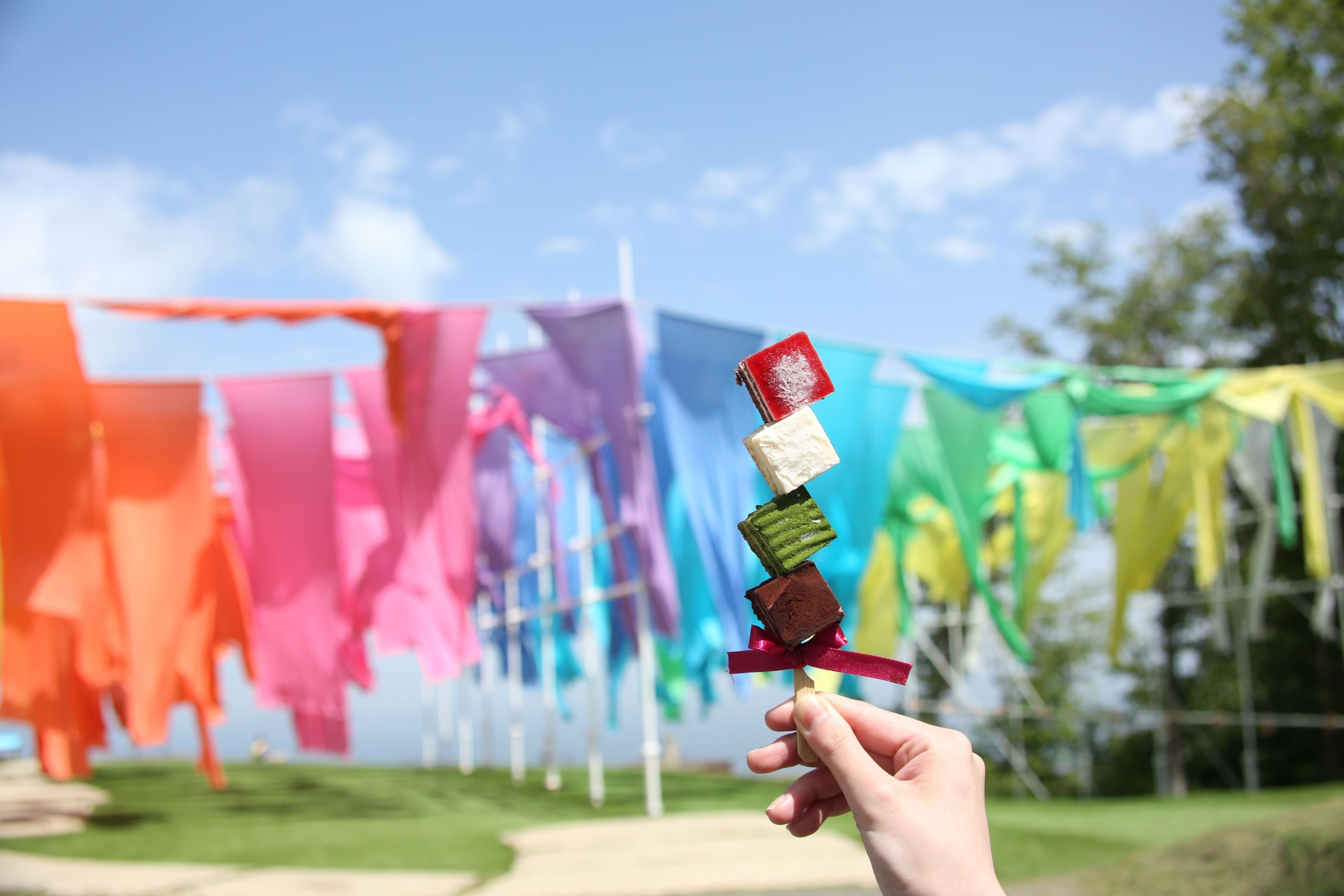 虹の発生率が高いこの地域の特性を、表現して虹色のカーテンを飾りました、