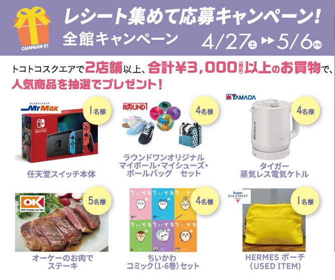 期間中、トコトコスクエアで2店舗以上、合計¥3,000円(税込)以上のお買物で、トコトコスクエアの人気商品が抽選であたる「レシート集めて応募キャンペーン」をはじめ、トコトコスクエアX(Twitter)アカウントをフォロー&リポストして抽選で10名様にトコトコスクエアの人気商品があたるフォローリポストキャンペーンを実施します。