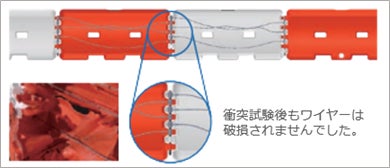 本体に内蔵されているワイヤー3本と金属製の接続パイプで本体同士を強固に連結し、一体化させることで、車両衝突時に本体が破壊されてもワイヤーにより反対側への侵入を防ぎます。
