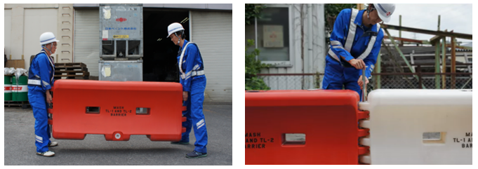 しかし、これまでの樹脂製防護柵は水を本体内に充填されてはいるものの連結部が弱く、車両衝突時に本体が破損、もしくは本体同士が分裂し、進入車両が樹脂製防護柵の反対側へ進入する可能性がありました。