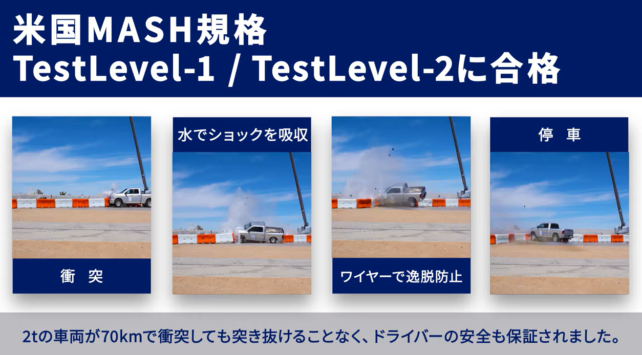 『ウォーター・ケーブル・バリアー』はすでに米国連邦高速道路局(FHWA) MASH規格に合格しておりしており、2トンの車両が時速70キロで衝突しても突き抜けることなく、ドライバーの安全も保障できました。