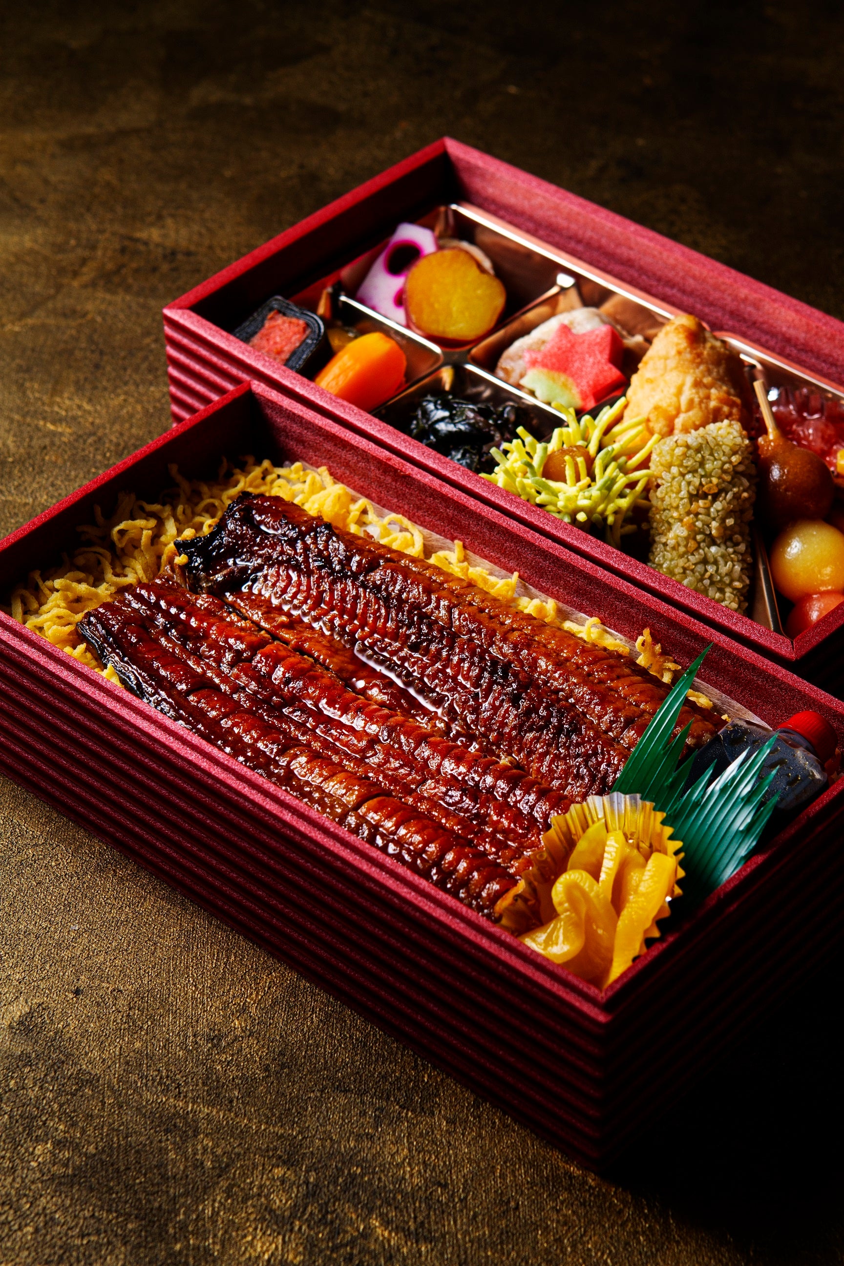 一段目には彩り豊かな四季折々の食材を詰め込み、二段目には柔らかくふっくらと仕上げたうな重を。