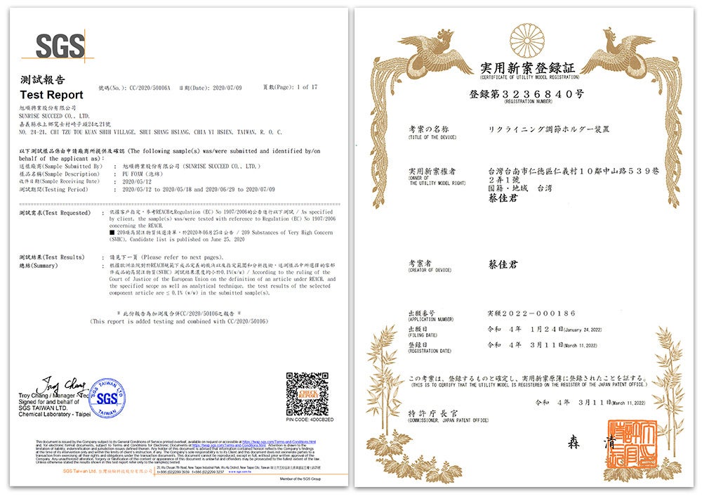LazyUP2.0は日本実用新案登録を取得しているだけでなく、SGSの厳格な耐荷重テストもクリア。台湾製ならではの高い品質と安全性を兼ね備えています。