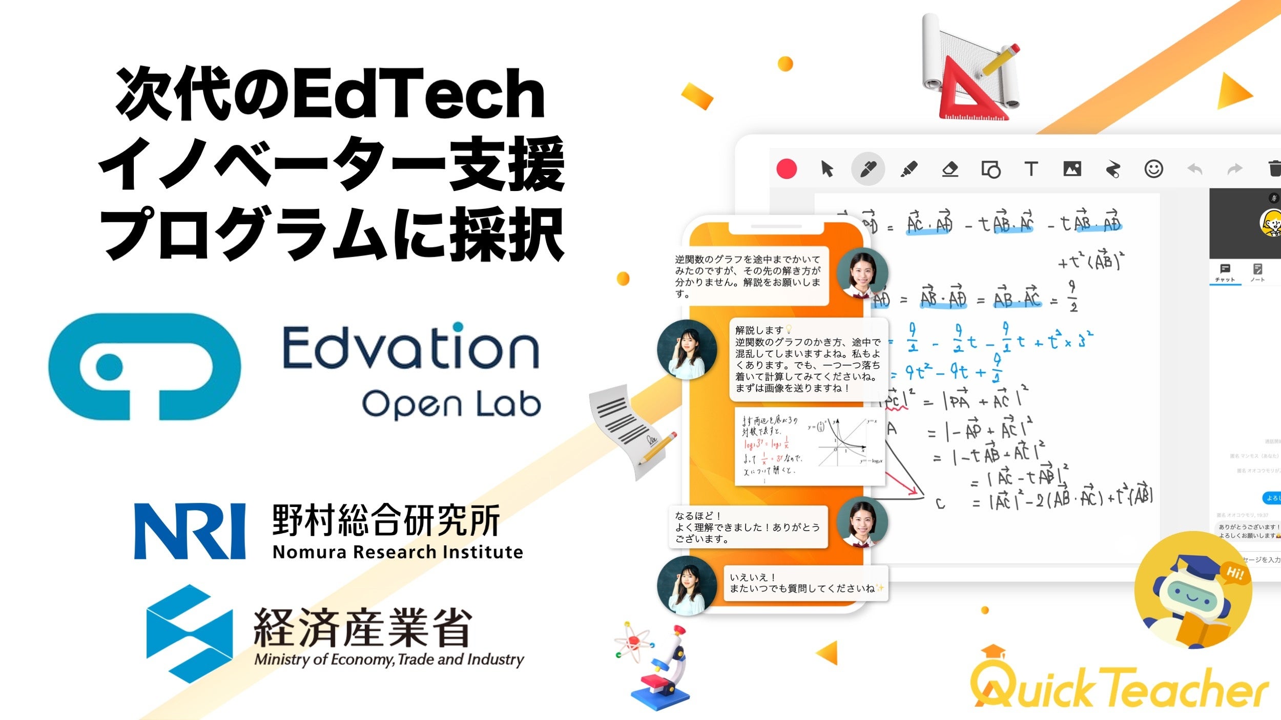 リアルタイム個別指導サービス「Quick Teacher」を運営する株式会社Eddが、経済産業省が実施する「次代のEdTechイノベーター支援プログラム」に採択されました。