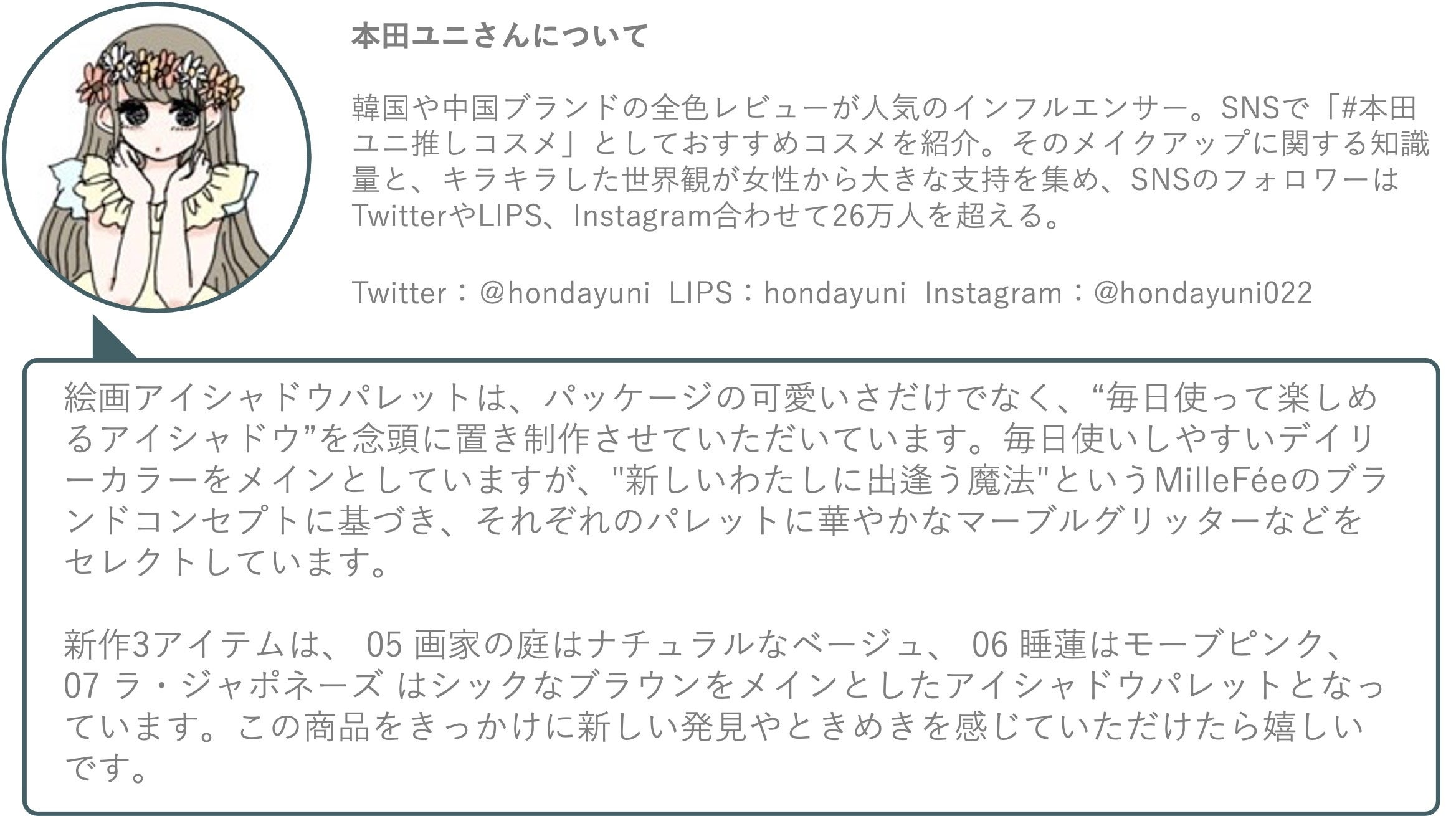 韓国や中国ブランドの全色レビューが人気のインフルエンサー。SNSで「#本田ユニ推しコスメ」としておすすめコスメを紹介。そのメイクアップに関する知識量と、キラキラした世界観が女性から大きな支持を集め、SNSのフォロワーはTwitterやLIPS、Instagram合わせて26万人を超える。