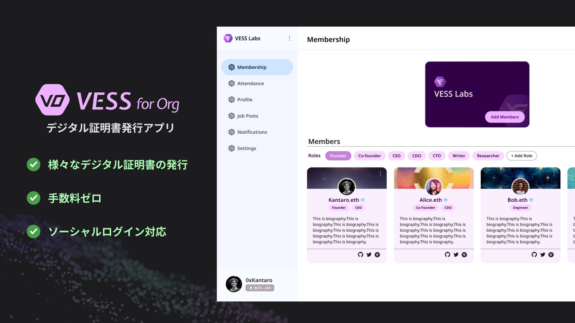 VESS Labsでは本プロダクトの他に、メインプロダクトとして信頼性の高い職務経歴書をデジタル上に構築する「VESS」プロトコルを開発に取り組んでいます。 信頼性の高い職務経歴書を構築するにはまず、確実に検証できる “デジタル証明書” が不可欠です。デジタル証明書は規格レベルでは実現に近づいてはいますが、現状その発行数はまだわずかです。そのため、まず信頼性の高いデジタル証明書の数を増やすためにも、弊社でもデジタル証明書発行プラットフォームを開発するに至りました。
