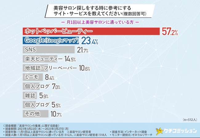 そこで、Googleマップ高評価クチコミ獲得支援ツール『クチコミッション』(https://about-kuchikomission.com/)を運営する株式会社Giv-ningは、①月1回以上美容サロンに通っている方②美容サロン経営者を対象に、「美容サロンの集客」に関する調査を実施しました。