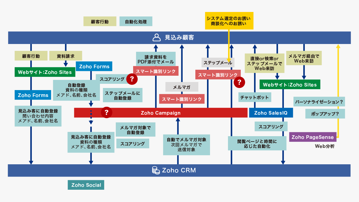 策定した「マーケティング設計図」に基づき、資料請求からWeb接客まで一貫した連動導線を構築。具体的には、Zoho CRMとSalesIQ、Campaigns、Sitesを連携させ、Webサイト訪問者の行動をリアルタイムに可視化し、最適なタイミングでの自動メール配信やアプローチを実現することで、自社Webを起点としたリード育成・商談化を可能にしています。
