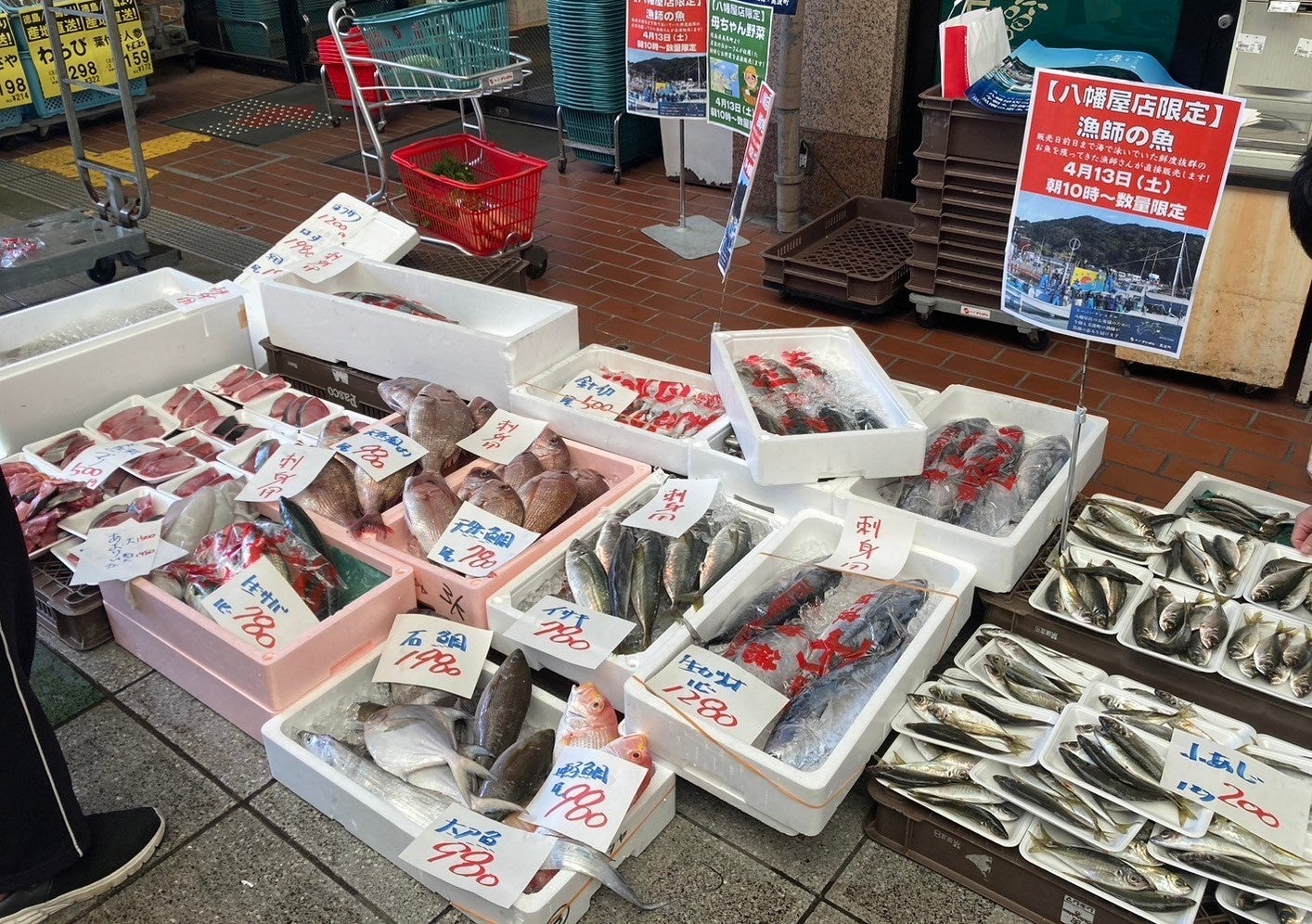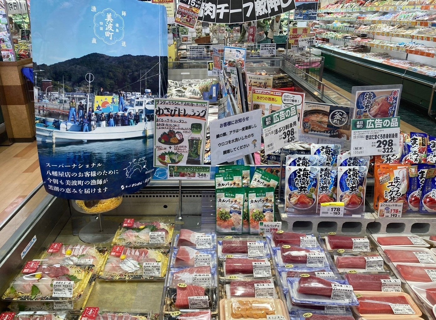 その支援の一環として、美波町で水揚げされる鮮魚の販路拡大と認知度向上を目的に、株式会社スーパーナショナル(大阪府大阪市大正区)の協力の下、2024年4月13日(土)、同社八幡屋店にて美波町若手漁師による対面販売会を開催し、好評のうちに終了しました。なお、3月23日(土)より開始した常設販売は、本対面販売会後も継続します。