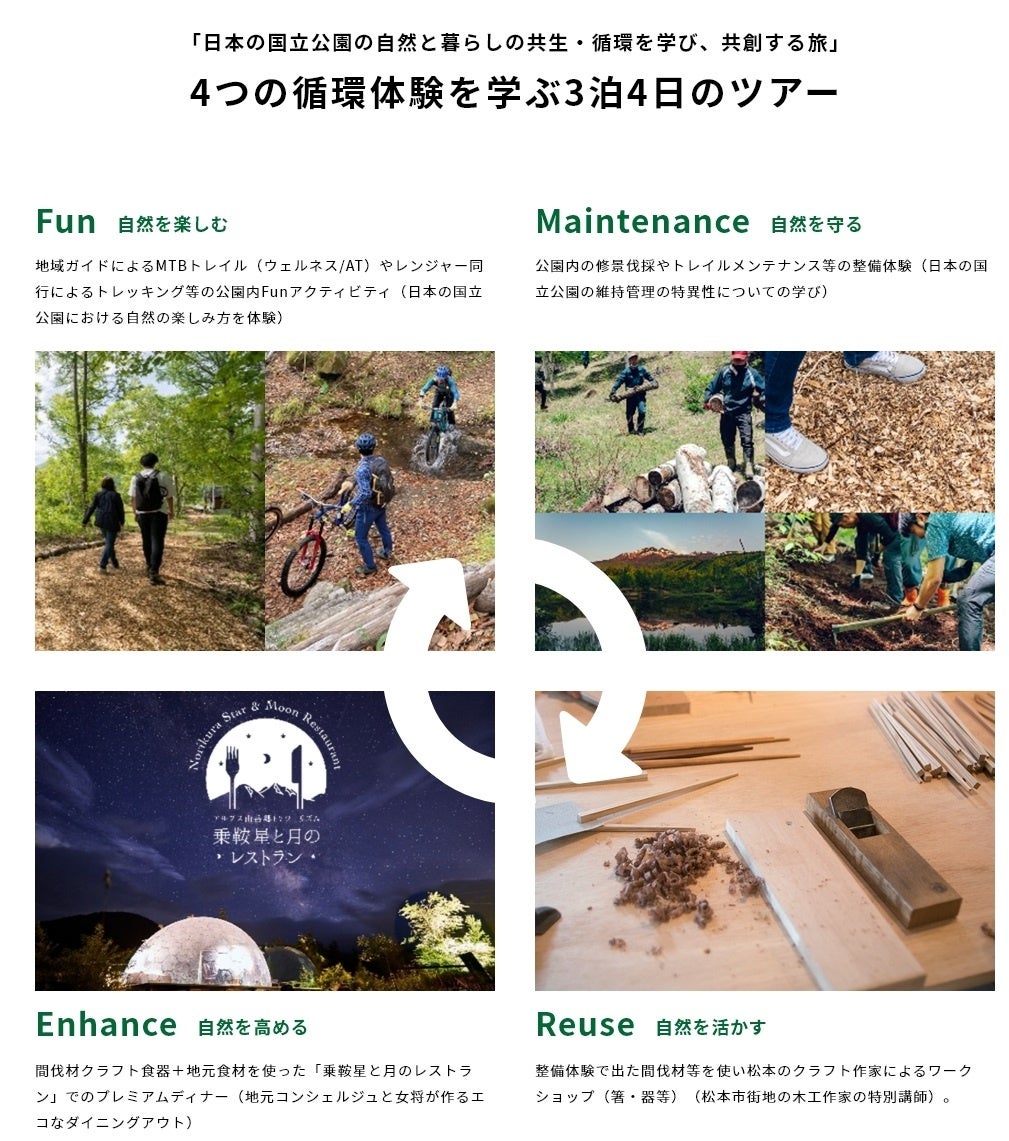 本ツアーは、ゼロカーボンパークである乗鞍高原(一の瀬園地)で、自然と暮らしの循環のしくみ体験を通して、地域とのつながりや自然への畏敬の念を思い起こすことを目的とした地域スルーガイド付きの3泊4日のツアーをご提供いたします。