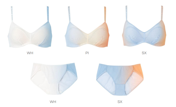本コラボレーションのテーマは「色温度」。“光の温度で下着を選ぶ”をコンセプトに、その日の気分や過ごし方を想像してデザインを選ぶ、新しい選択肢の提案です。太陽が昇る朝の「赤色」から雲から最も高く昇った陽が差し込む昼どきの「青色と白色」、そして夕焼けに移り変わっていく「青色から赤色」といった一瞬を切り取り、グラデーションで表現しています。商品ラインナップはブラ3色、ショーツ2色。どの色も素敵に組み合わせられる仕様です。