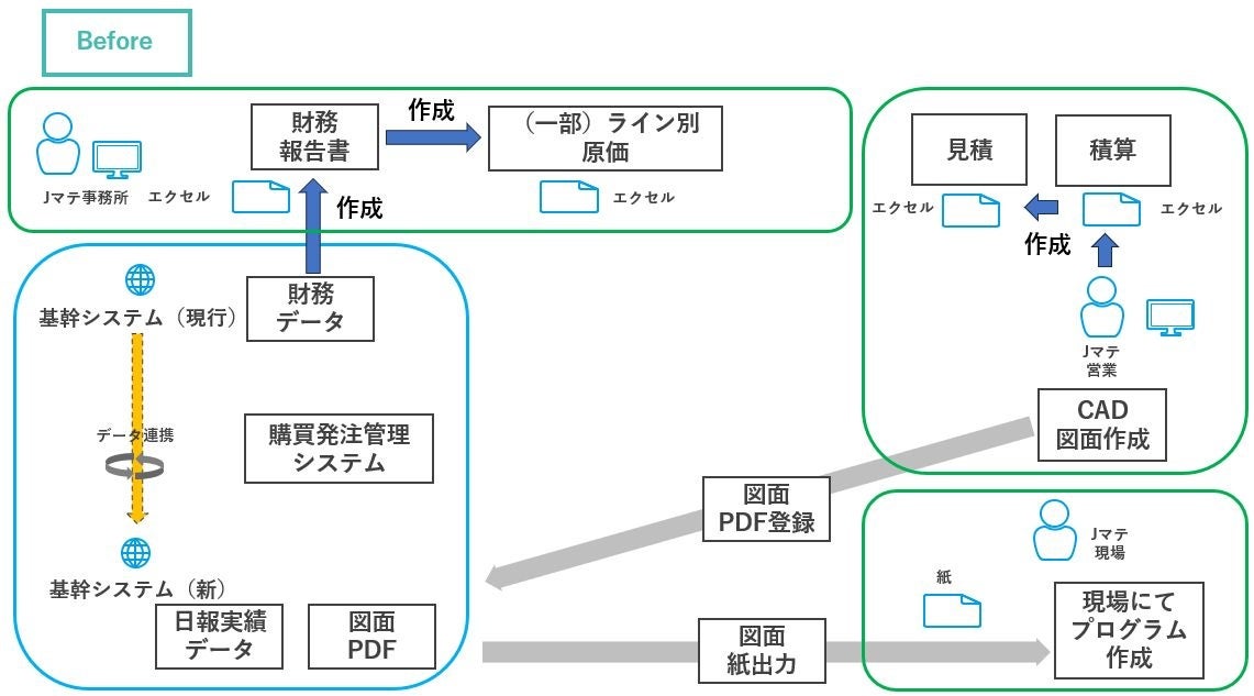 今まで各PCに保管されていたCADデータ、営業個々で保管していたエクセルでの見積積算データ、基幹システムで活用されていなかった購買発注システムの入力データを再構築します。これらを一気通貫のデータとしてシステム統合し、今まで工場単位で把握していた原価の仕組みをデータとして利活用を行えるシステムを構築することで、ライン毎に原価を見える化、営業での見積積算後、製造への図面データ配信の円滑化、各種データを組み合わせて活用出来る流れを作ります。