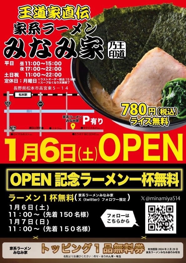 グロースパートナーズ株式会社(本社:東京都目黒区、代表:古川徳厚 )は松本市高宮東に2024年1月6日(土)より王道家直伝 「家系ラーメン王道乃印みなみ家」をオープンしました。