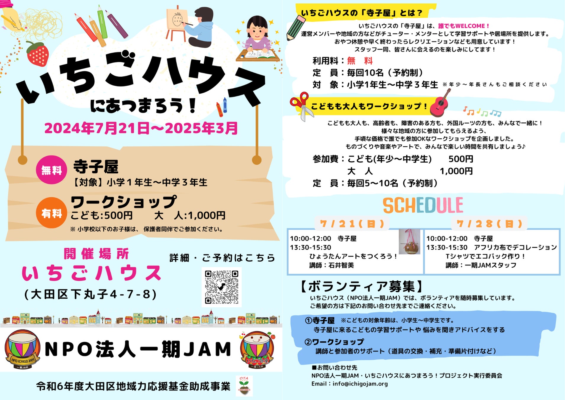 NPO法人一期JAMは、地域の子どもたちと住民が集まり、共に学び交流する「いちごハウスに集まろう!プロジェクト」の夏休み期間中のスケジュールを発表しました。