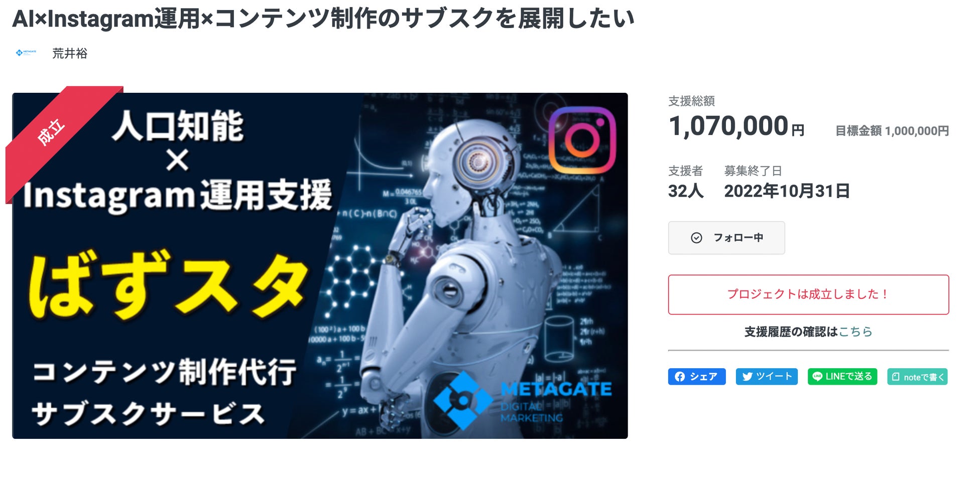 Instagram運用支援のMetaGate合同会社のクラウドファンディング(2022年9月14~2022年10月31日)が最終日残り10分で成功し、目標金額100万円を超える107万円で終了いたしました。