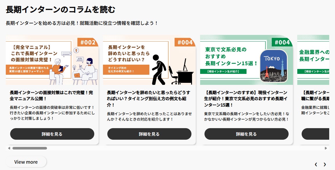 コラムページでは「理想のインターン生の採用方法」や「学生の成功事例」など、企業が参考にできるコンテンツを随時追加。インターン採用をさらに効果的に進めるヒントを提供します。