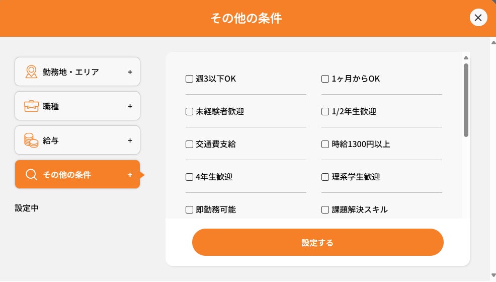 「週3日以下勤務」や「土日勤務可能」など、学生のライフスタイルに合わせた検索が可能に。