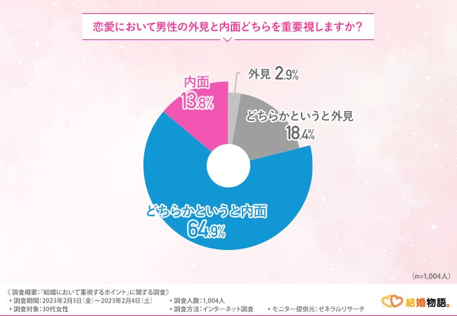 8割近くの女性が、恋愛において内面を重視し、結婚相手には外見以外で性格を重視している方が多いことがわかりました。