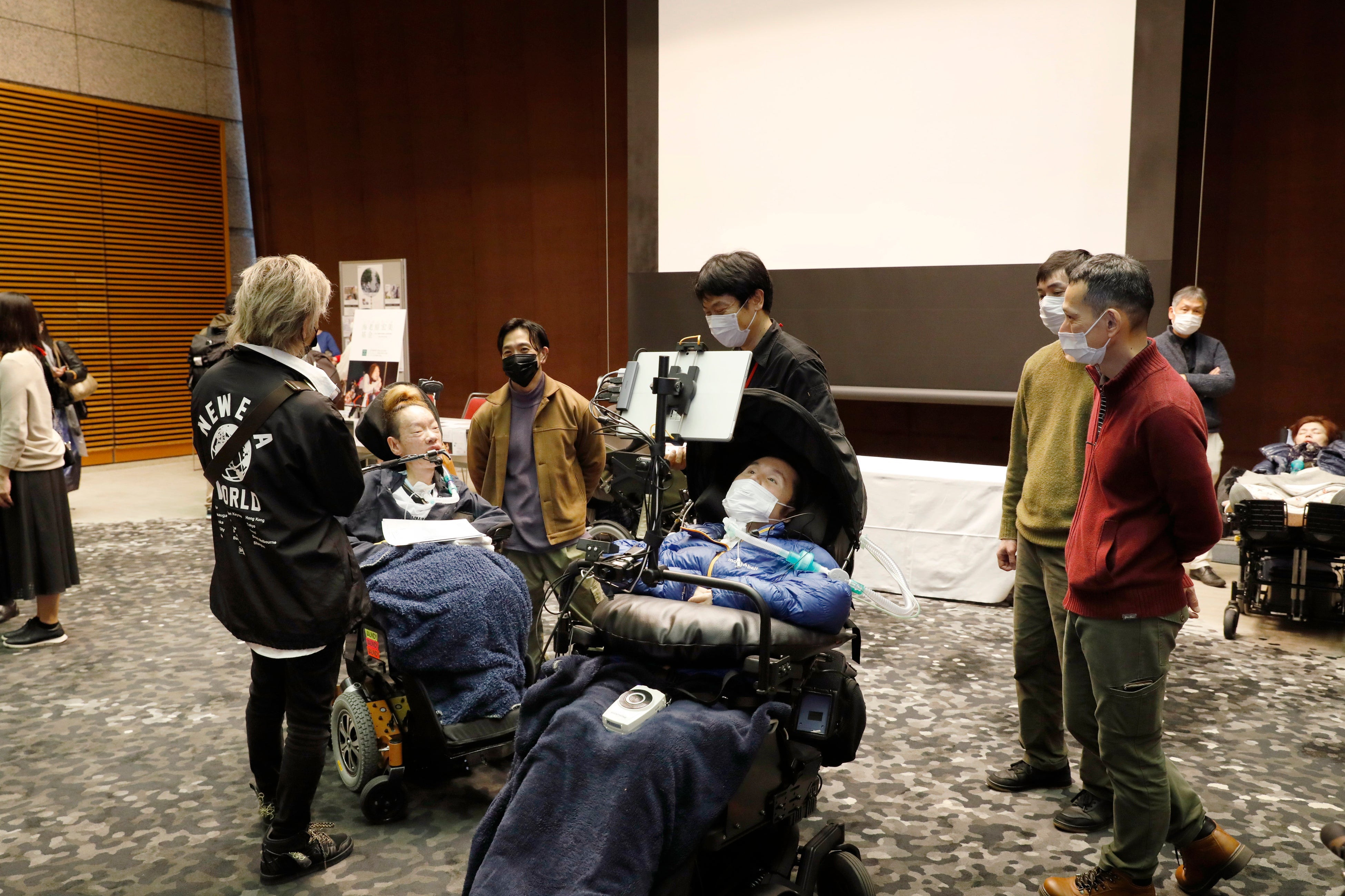 当日は、日頃から医療的ケアニーズのある方々の支援や研究に関わってこられた先生方をお招きしてのパネルトークや、視線入力で操作できる塗り絵ゲーム対戦、視線入力で移動や姿勢変更を自分で行える車椅子の体験、ドキュメンタリー映画やユニーバサルイベントの紹介などが行われました。