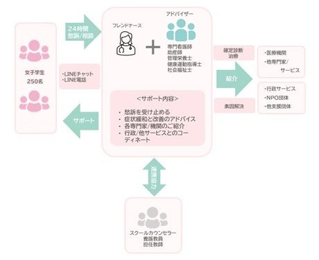 福岡市近郊の高等学校に通学している女子高校生を対象に3カ月間、臨床経験20年のフレンドナースを中心に4名のアドバイザー(助産師、管理栄養士、健康運動指導士、社会福祉士)によるLINEチャット相談を実施。思春期女子の身心の不調や悩みを、日常的にナースとチャットで会話し、身心の正しい情報を得たり、「受診のススメ」などのアドバイスを受ける中で、思いを伝える、他人に相談する、診察を受ける/受けないなどの意思決定を含めた生活習慣改善などの統合的なサポートを実施