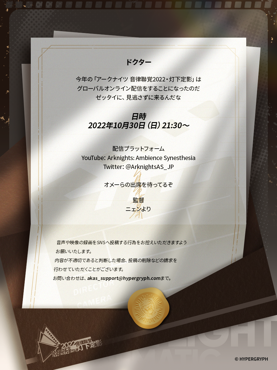 『アークナイツ 音律聯覚』は、スマートフォンゲーム「アークナイツ」の世界観を基にした、音楽やダンス、ホログラフィックなどの要素をふんだんに練り込んだゆえ、バラエティに富んだ大型音楽イベントです。「音律聯覚2022ー灯下定影」は10月30日(日)21:30から、TwitterとYoutubeで同時配信を行いますので、ドクターの皆さん、ぜひお越しください。