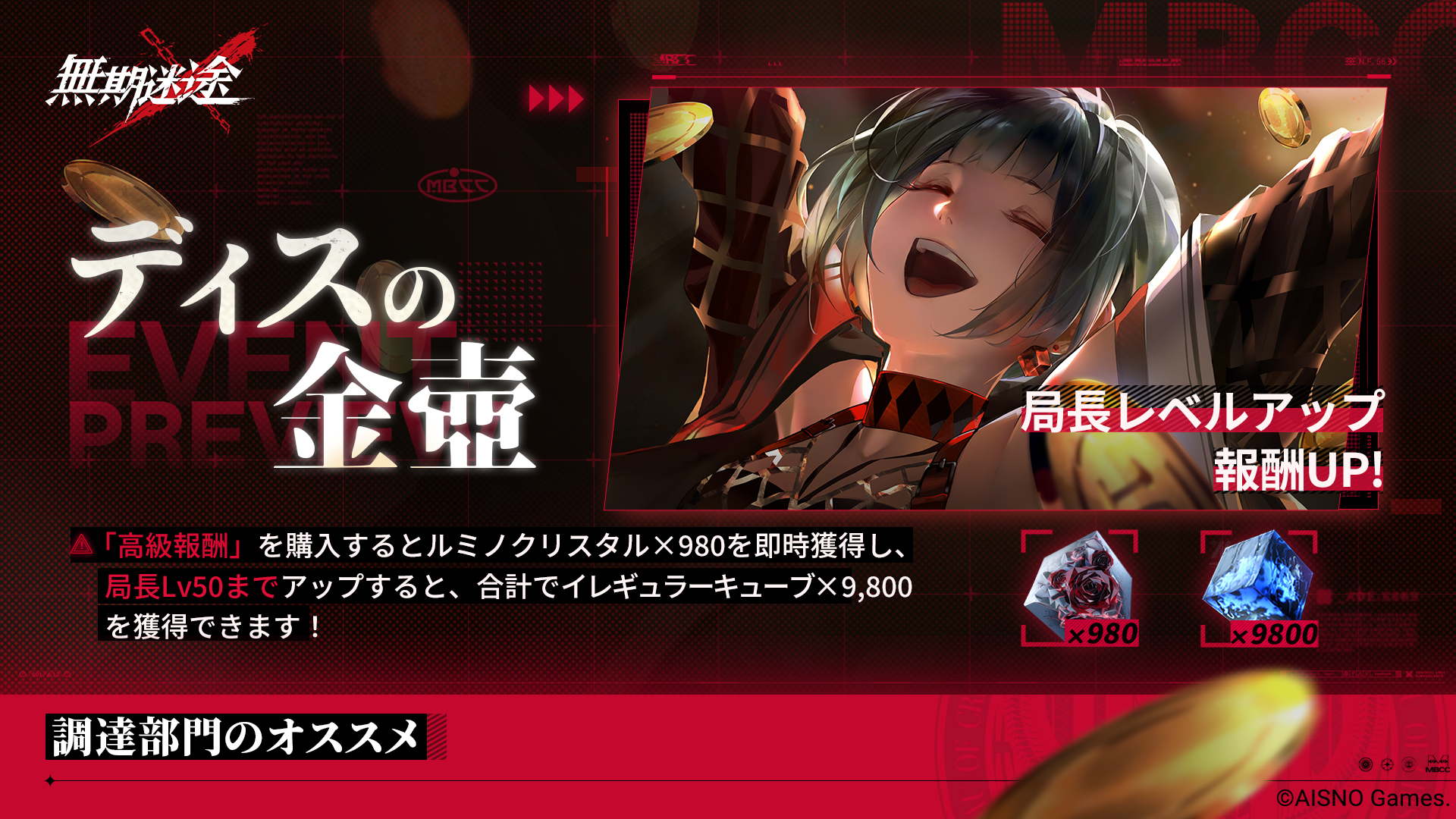 イベント「ディスの金壺」では、ゲーム内の【局長レベル】に応じて、アイテムの報酬を継続的に受け取ることができるようになります。また「プレミアム報酬」を購入すると、有料アイテム「ルミノクレスタ」980個を獲得することができます。さらに局長レベルを50レベルに上げると、合計9,800個の「イレギュラー・キューブ」を獲得することができます。