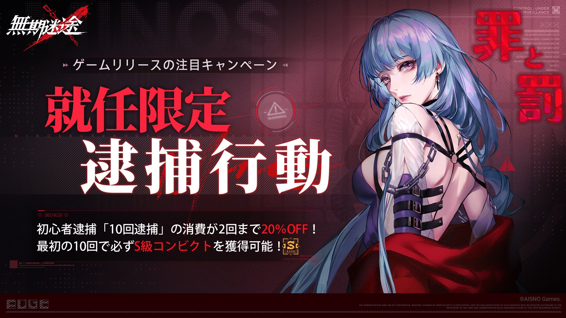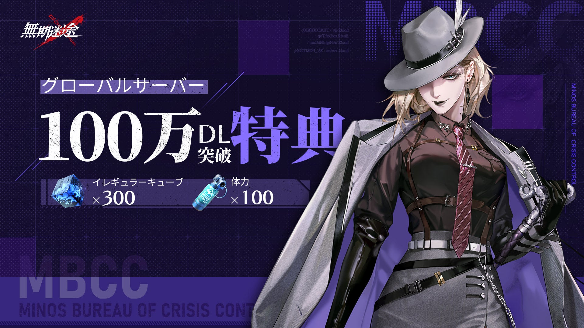AISNO Gamesがパブリッシングを行うダウンロード無料のスマホゲーム、罪悪都市プリズン戦略RPG『無期迷途』において、グローバルDL数が100万を突破いたしました。100万DLを記念して局長の皆様へゲーム内にて特典を配布いたしました。また2022年11月10日(木)にゲーム初バージョンアップデート実施に先駆けて、本日11月4日(金)にイベント『サンドレイダース』のPVを公開したことをお知らせいたします。