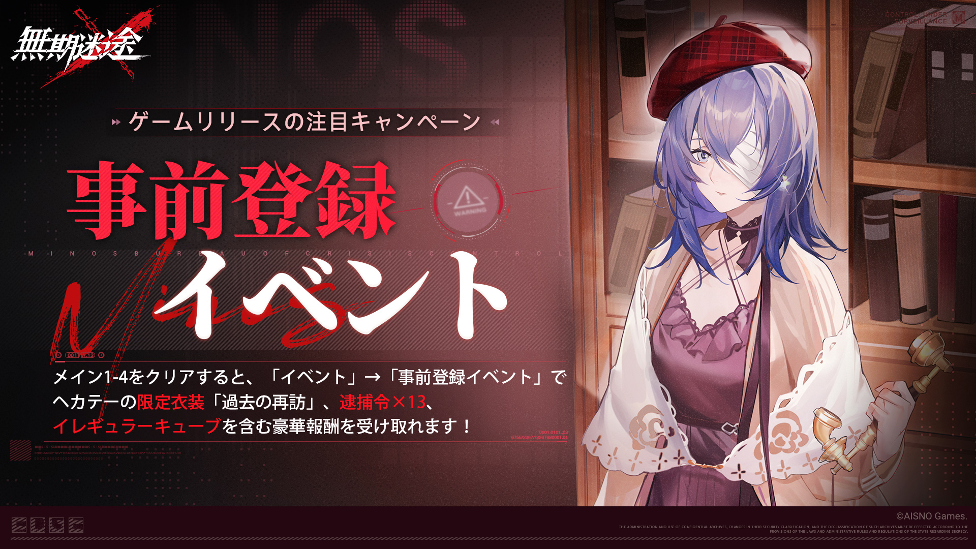 メインストーリー1-4をクリアするとホーム画面の左上、レベルアイコンの下に「イベント」が開放されます。事前登録イベントでは、コンビクト「ヘカテー」の限定衣装「過去の再訪」やガチャに利用できる「イレギュラーキューブ」、ガチャチケット「逮捕令」×13枚を獲得することができます。