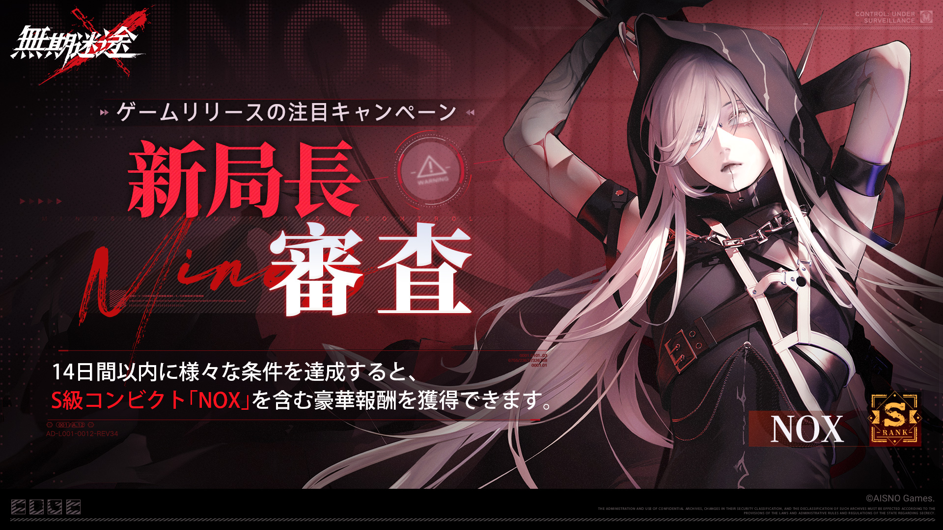 メインストーリー1-4をクリアすると、「新局長審査」任務が開放されます。ゲーム開始日から14日間以内に各任務をクリアして、「素質の印」を累計65個を獲得するとS級コンビクト「NOX」を逮捕することが可能です。また豪華報酬も獲得できます。