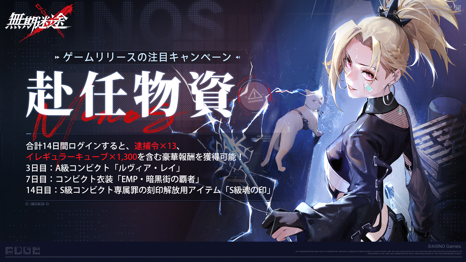 合計14日間ログインすると 、A級コンビクト「ルヴィア·レイ」、コンビクトEMPの衣装「EMP·暗黒街の覇者」、ガチャチケット「逮捕令」×13、「イレギュラーキューブ」 ×1,300を含む沢山の豪華報酬を獲得可能です。
