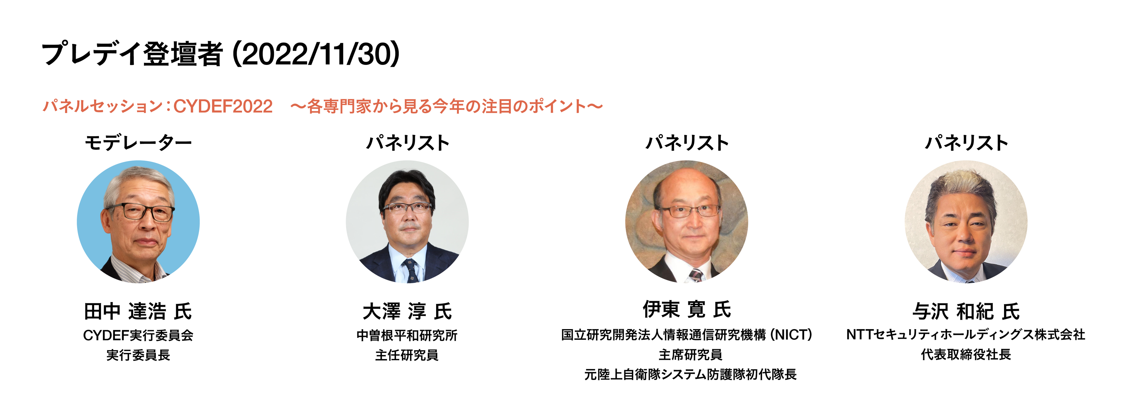 今回のCYDEF2022プレデイでは過去のCYDEFの議論の振り返りから今回の2022のテーマ選定に至るまでの経緯を事前にご説明するイントロセミナーと、学識・防衛・企業界から各界の専門家、大澤 淳氏(中曽根平和研究所)、伊東 寛氏(国立研究開発法人情報通信研究機構)、与沢 和紀氏(NTTセキュリティホールディングス株式会社)の三名の方をお呼びし、翌日からのメインデイカンファレンスの注目点や議論の焦点についてお話しいただくトークセッションを開催いたします。