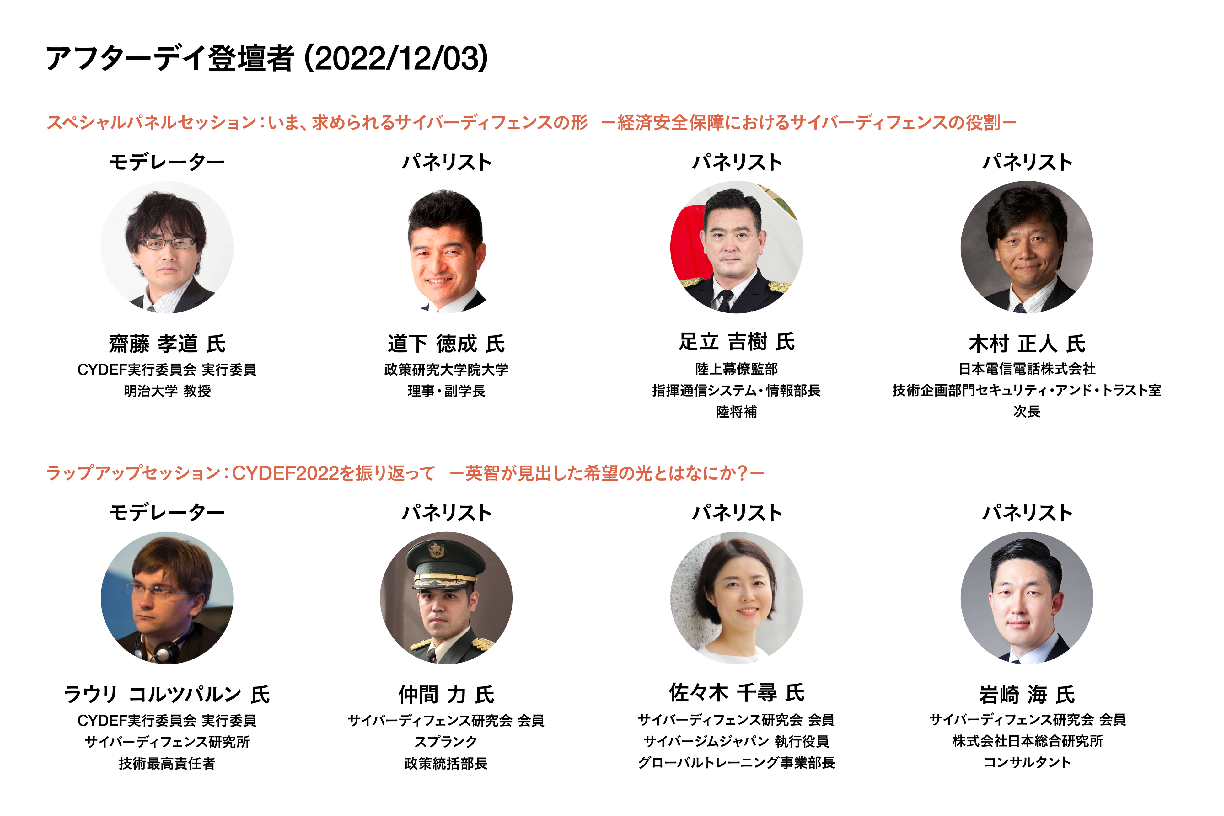 メインデイが終わった翌日の12月3日にはアフターデイとして、ラップアップイベントを実施します。こちらでは、いま話題の経済安全保障とCYDEFのメインテーマであるサイバーディフェンスを取り上げ、「いま、求められるサイバーディフェンスの形 ー経済安全保障におけるサイバーディフェンスの役割-」をテーマに学識・防衛・企業の各界でサイバーディフェンスの最前線で活動される道下 徳成氏(政策研究大学院大学)、足立 吉樹氏(陸上幕僚監部)、木村 正人氏(日本電信電話株式会社)の三名の方をお呼びし、主催CYDEF2022実行委員会 実行委員 から齋藤 孝道氏(明治大学)がモデレータとなり議論します。