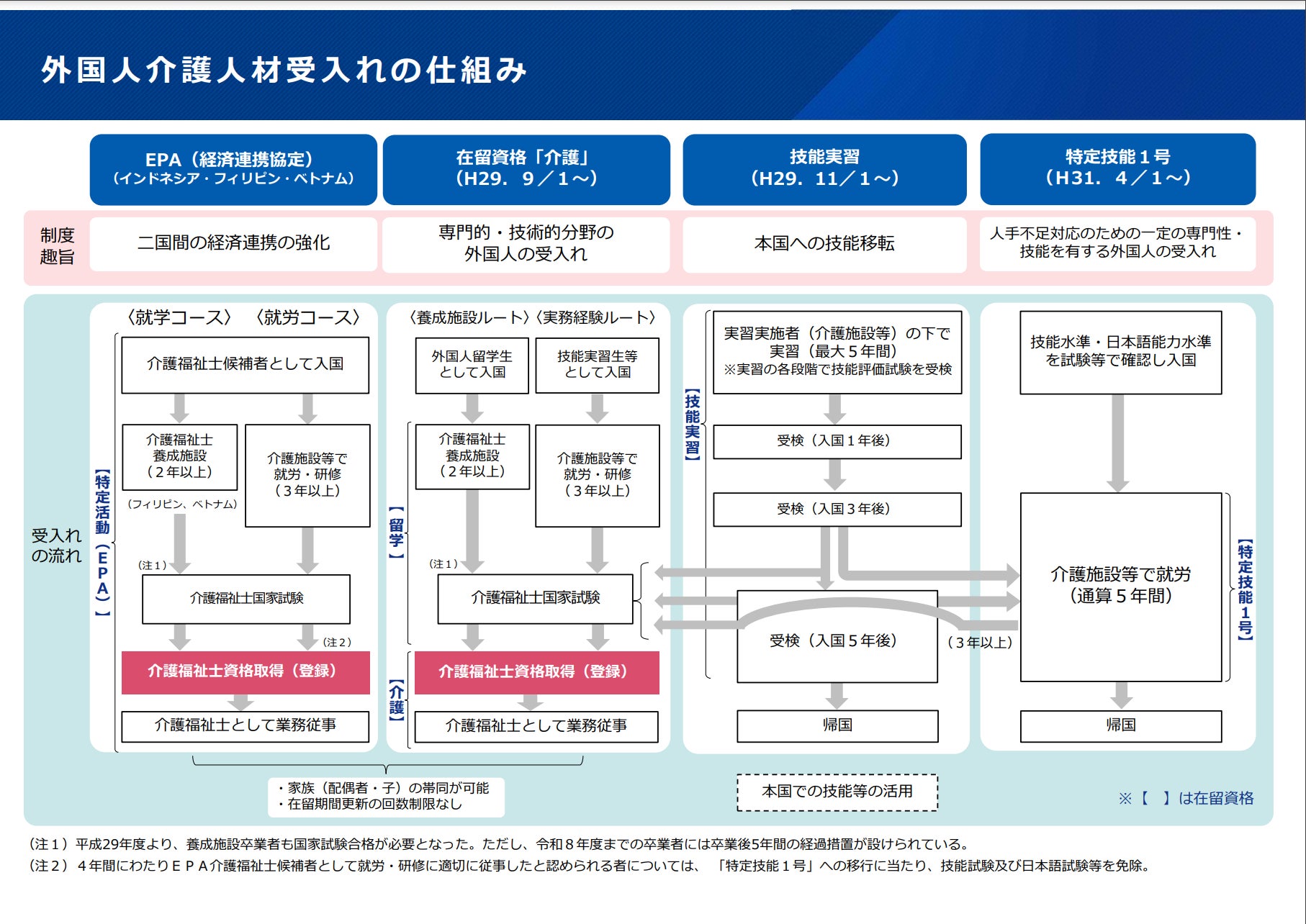 他方、介護業界に目を向けてみると、日本の介護業界では、人手不足を補うために外国人労働者の雇用が進んでいます。これらの制度には、経済連携協定(EPA)、在留資格「介護」、技能実習、特定技能などが含まれます。