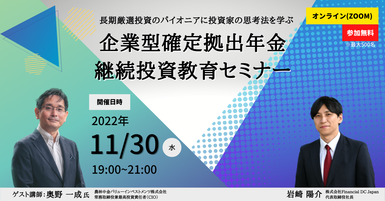 株式会社Financial DC Japan(本社:愛知県名古屋市、代表:岩崎 陽介)は、2022年11月30日19時にオンラインにて「企業型確定拠出年金継続投資教育セミナー」を開催いたします。ゲストに長期厳選投資のパイオニア、農林中金バリューインベストメンツ奥野一成氏を迎え、これからの時代をたくましく生き抜くために役立つ“投資家の思考法”について語っていただきます。オンライン開催で参加費無料です。
