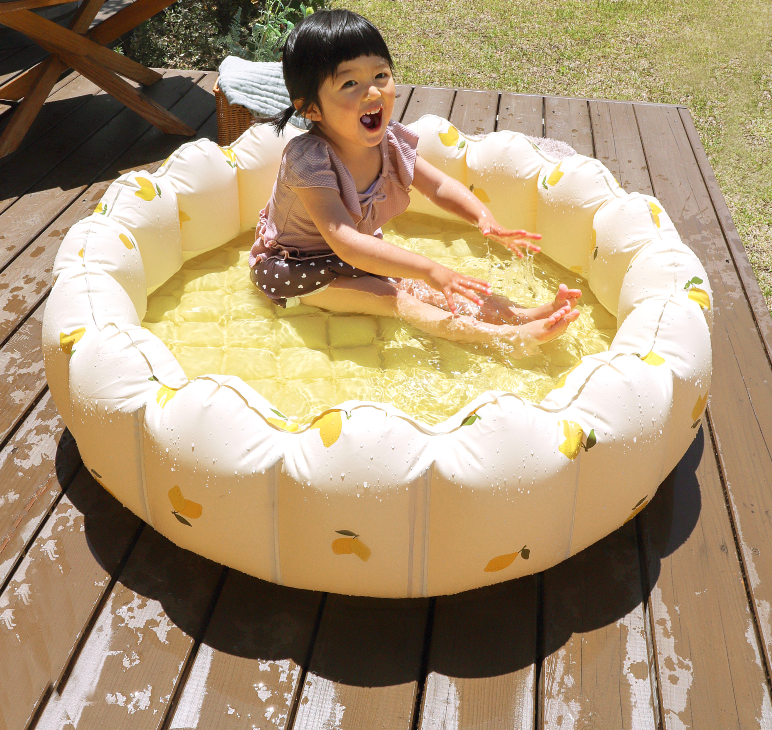 大人気のチェリー・レモン柄デザインのかわいい水あそびプールが登場。底部まで空気が入るエアクッション仕様の為、底つき感を軽減し安心して遊べます。お子さまにちょうどいい大きすぎず小さすぎないサイズなので集合住宅のベランダでも遊べます。