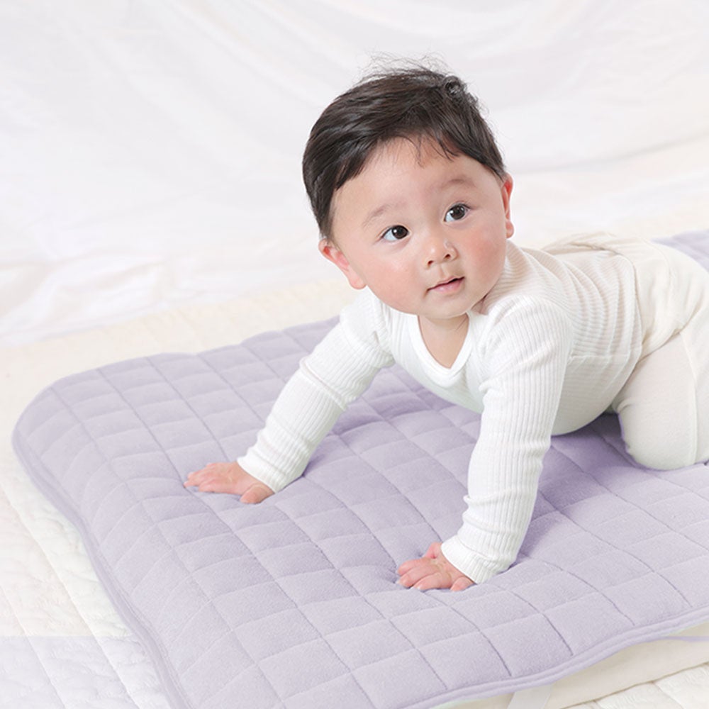 汗とりパッドと防水シーツ2つの機能を備えた1枚2役の敷きパッド。肌に優しい綿100%パイル生地を採用し、程よいふわふわとした厚みで赤ちゃんも快適に過ごせます。くすみカラーの5色展開です。