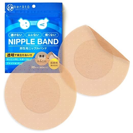 ケラッタのベストセラー「NIPPLE BAND」から、汗・水に強い肌色透明バージョンが登場。スポーツシーンでの摩擦によるスレや日常の乳首の透け防止に大活躍。注射の後の保護パッドとしても使われている医療用素材を使用し、敏感肌の方でも安心してお使いいただけます。切り取り線付きで携帯用にも便利なパウチ入りです。